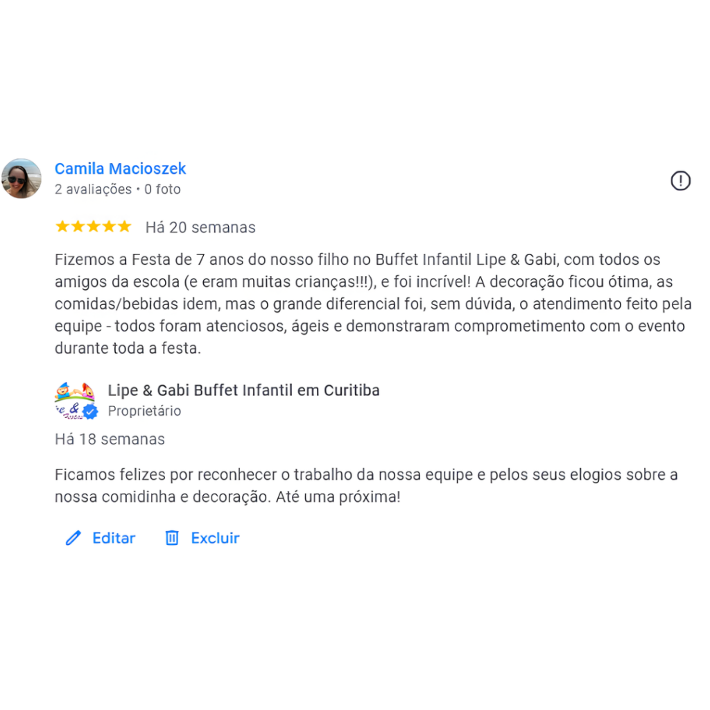 O Buffet Infantil Lipe e Gabi em Curitiba criou um sistema de organização simples, enxuto e direto. Sinônimo de serviço impecável e sem esforço onde o stress é mínimo para a equipe e para todos os envolvidos no processo de organização das festas infantis. A mais de 12 anos seguimos com esse formato e tem trazido elogios dos nossos clientes e satisfação plena em todos os eventos.
